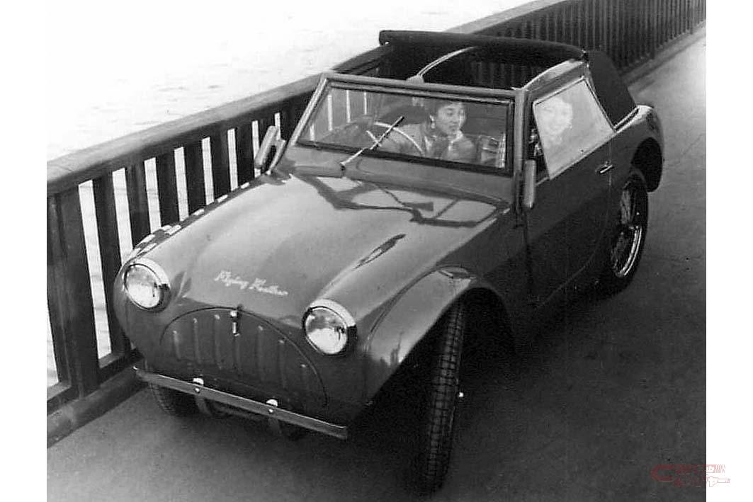 片山さんは戦後の復興期に適した車はこれだと、温めていた構想を富谷龍一に伝えたところ賛同を得て、住江製作所の手により車は完成、フライングフェザー=F/Fと名付けられた。フライングフェザーの名は、開発コンセプトに合わせたという記事もあるが、夢多きオトッツァンが戦前から意中にあり温めていた名前だったと聞いたことがある。
