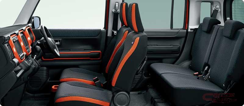 今回の一部仕様変更では、全車速追従機能付きのアダプティブクルーズコントロール(ACC)と車線逸脱抑制機能を全車標準装備したほか、狭路でのすれ違い時の接触防止をサポートするすれ違い支援機能の設定や、HYBRID GターボにLEDヘッドランプを追加するなど安全装備を充実。また、HYBRID X、HYBRID XターボにはUSB電源ソケットと時間調整付フロント間欠ワイパーを装備した。ボディカラーでは、新たに採用したソフトベージュ2トーン仕様車に「コーラルオレンジメタリック」を設定し、全13パターンを用意。さらに、2トーン仕様車のバンパーガーニッシュをボディー同色からルーフ同色に変更した。