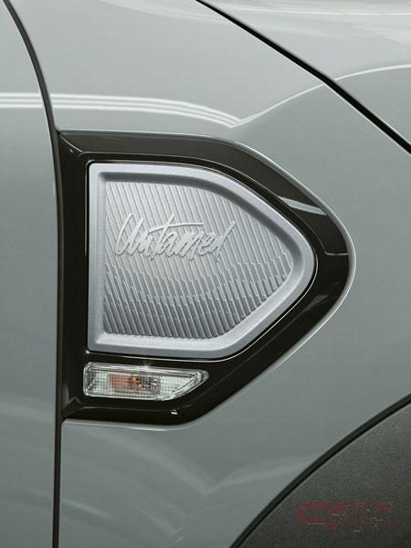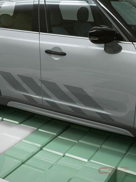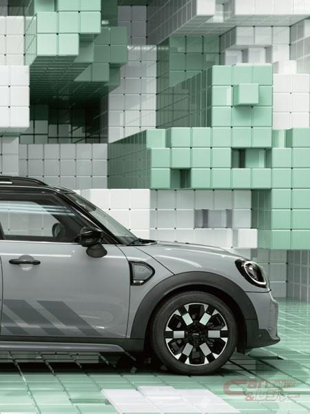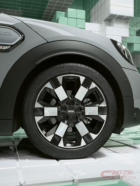 専用ボディ・カラーとなる「モメンタム・グレー」にブラック・ルーフを採用。ピアノ・ブラックのパーツを随所に取り入れると共に、MINIエンブレム、エア・インテーク、アンダー・ガードなどの加飾パーツを、ボディ・カラーに統一することで、落ち着きあるモノトーンとした。18インチ2トーン・カラーのホイールはUntamed専用に開発され、サイドに施されたフローズン・ブルー・ストーンの大胆なデザインのストライプとMINI ALL4エクステリアが、パワフルなSUVらしさを表現している。