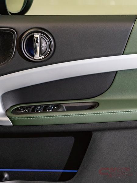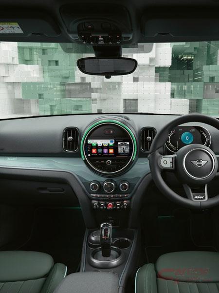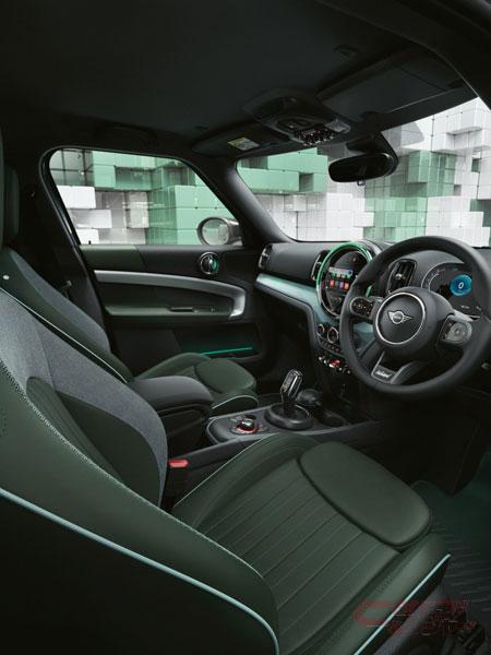 自然からインスパイアされたブルーとグリーンを基調としたインテリアは、運転席メモリー機能付の電動シートとシート・ヒーターを備えたMINI Yoursレザー・ラウンジ・シートとドアのアーム・レスト部分を専用色ハイランド・グリーンで統一。また、Untamed専用インテリア・サーフェスは、フローズン・ブルー塗装にUntamedのロゴが浮かび上がる特別仕様で、カスタマイズ可能なアンビエント・ライトを装備。高品質ナッパ・レザーを用いたステアリング・ホイールのスポーク下部にはUntamedエンブレムが配され、雄大なランドスケープをモチーフとしたドア・シル・プレートやフロア・マット等、インテリアの随所にUntamed 専用デザインを採用している。