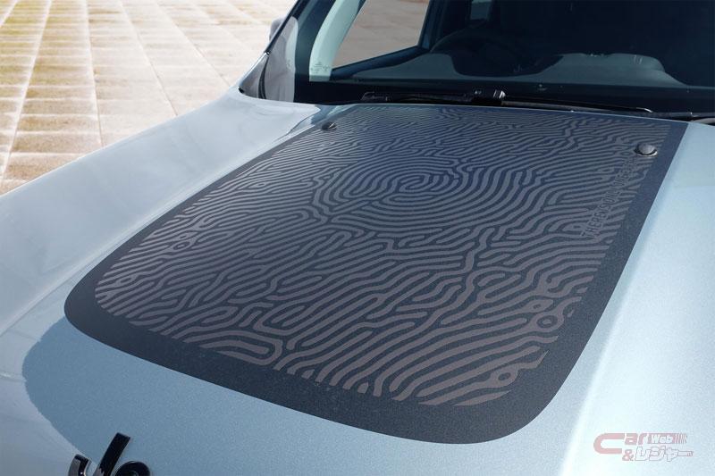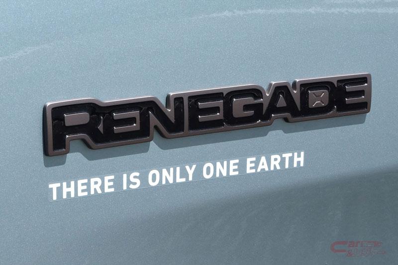 外板色は、澄んだ水面をイメージさせる専用色のアズーマッターメタリックを採用。ブラック仕上げのルーフでスポーティさを演出しているほか、エンジンフードにはUpland専用のデカールがあしらわれ、同デカール上ならびに前席ドアのRenegadeバッジの下部には、「THERE IS ONLY ONE EARTH」と記されたデカールを装着。さらにブロンズのアクセントを用いた専用フロントグリルや、グロスブラック仕上げの17インチアルミホイールならびにドアミラーにより、外板色とのコントラストを際立たせた精悍なエクステリアとなっている。