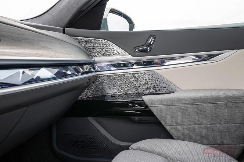 インテリアにおいては、12.3インチのメーターパネルと、14.9インチのコントロール・ディスプレイを一体化させ、ドライバーに向けて湾曲させる事で視認性を向上しているのに加え、ラグジュアリー感を演出。コクピット周りにおいては、最低限のスイッチ類のみとし、クリスタルを多用する事で、すっきりとかつ高級感を印象付けている。先代モデルに比べ約40%ガラス面積を増やしたパノラマ・ガラス・サンルーフを標準装備しているほか、リアの居住性をさらに向上する「エグゼクティブ・ラウンド・シート」をオプションとして設定した。