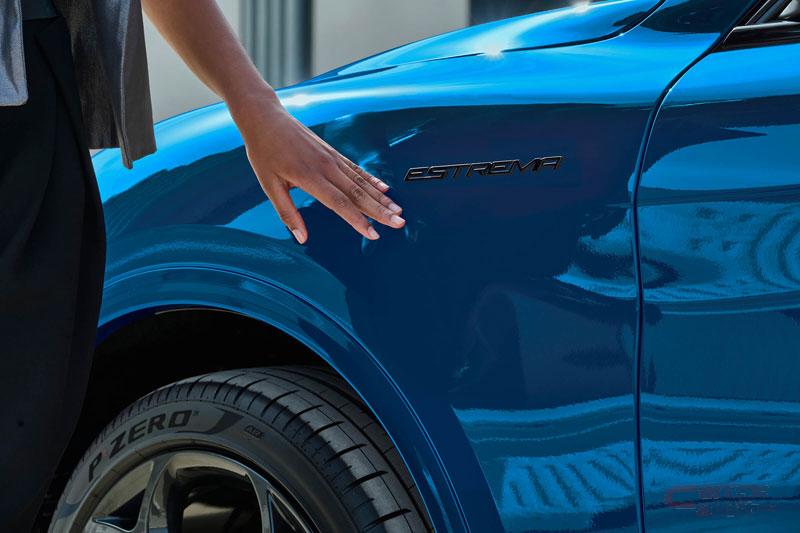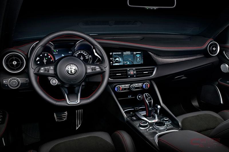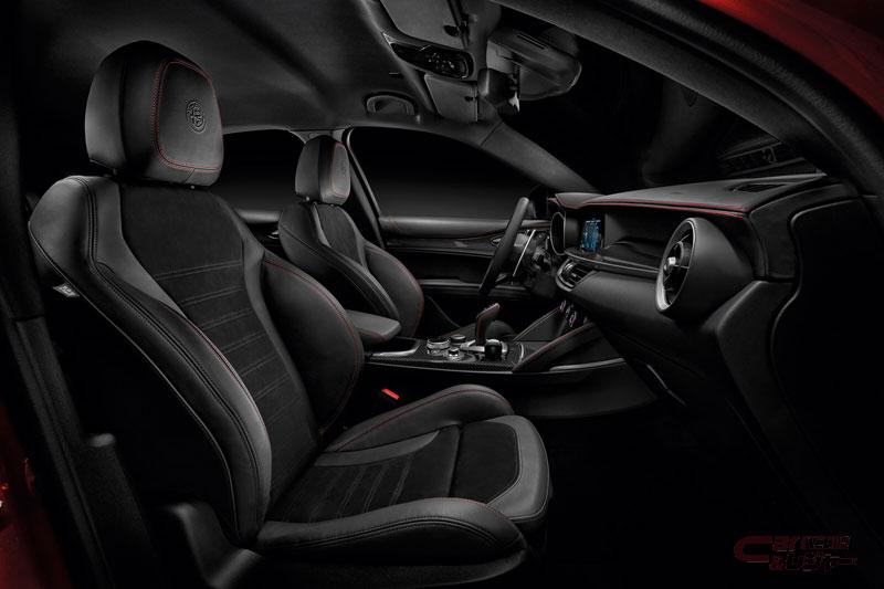 限定車が冠する“ESTREMA(エストレマ)”は、英語のEXTREME(エクストリーム)に相当する “極限、極致”を意味するイタリア語となる。エクステリアは、カーボンファイバー製のフロントグリルインサートやサイドミラーハウジング、ダークエンブレムなどを採用したほか、ブラック仕上げのブレーキキャリパー、ダークデザインのアルミホイール(ジュリア)など、ブラックを基調としたパーツを採用し精悍さを強調。