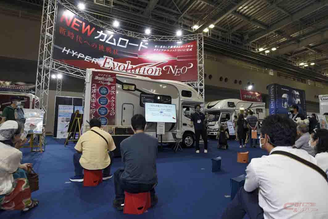 ショーを主催する日本RV協会では〝キャンピングカー365デイズ〟として、キャンピングカーが持つ日常的な有効性をアピール。キャンピングカーが災害時に、ベースキャンプとして役立つ機能を紹介した。