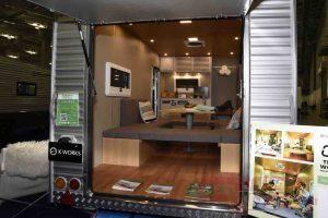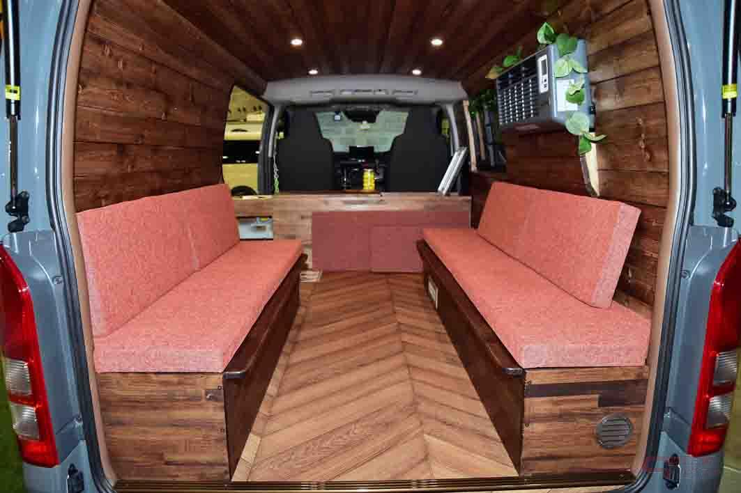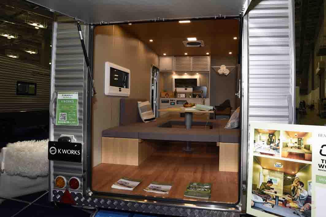 今年4月よりキャピングカーの構造要件の一部改正を受け、従来は物理的に不可能だった小型商用車や軽商用車でも〝8ナンバー化〟が可能となり、展示車の一部に見られた。また、盛夏に向かうイベントとして、車内を快適に過ごす必須アイテム、エアコンの常時使用を可能にする電装システムの搭載や、重要性を訴求する出展も目立った。一方、近年RVパーク等で設置が進む、外部給電設備の利用を前提とした“新しい”エアコン利用法も紹介された。