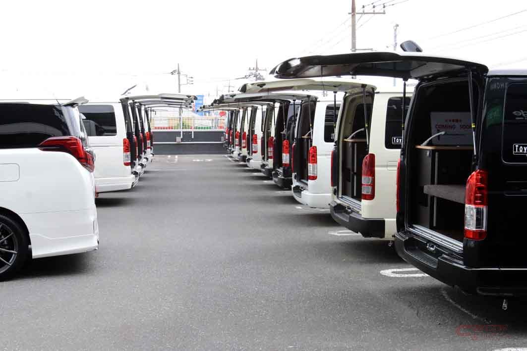 キャンピングカーでは、ハイエースをベースとするキャンピングカーづくりでは国内トップレベルのビルダー「トイファクトリー(本社・岐阜県可児市)」が製作したモデルや、U-BASE専用モデル(車中泊モデル、簡易ベッドモデル)等を展示・販売している。