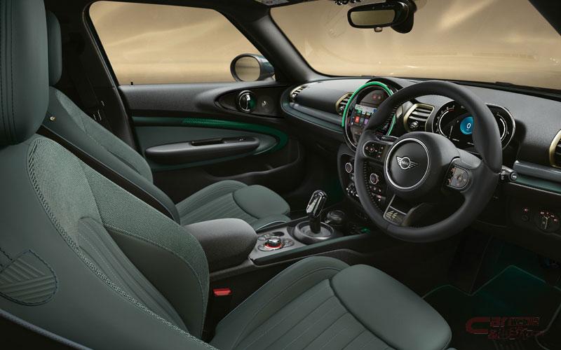 インテリア全体も専用色セージ・グリーンを基調に、ブラス・カラー・アクセントを随所に採用。上質なレザーを用いたMINI Yoursレザー・ラウンジ・シートは、クリア・ブルーのステッチが施されたセージ・グリーン・カラーを採用し、ステアリング、エアコン吹き出し口、ドア・シル・プレートに施されたブラス・カラーが印象的なコントラストを描き出している。ドア・トリム、フロア・マットなどもセージ・グリーンで統一し、ドア・トリムのイルミネーションは繊細なストライプ・パターンとグリーンの配色を組み合わせた専用デザインを採用した。