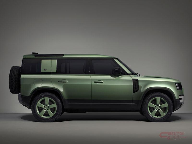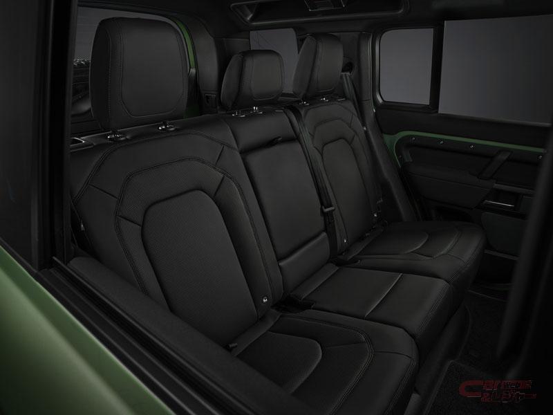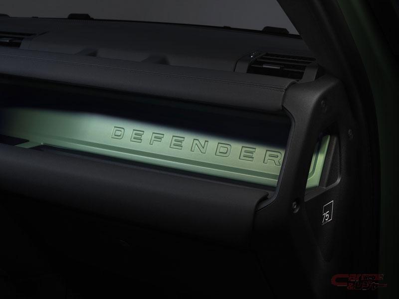 また、「DEFENDER」初となるアイコニックなグラスミアグリーンを特別仕様車専用エクステリアカラーとして採用したほか、20インチアロイ ホイールとホイールセンターキャップにも同色を使用。さらに、75周年グラフィック、セレスシルバーのバンパー、プライバシーガラスなどを組み合わせている。