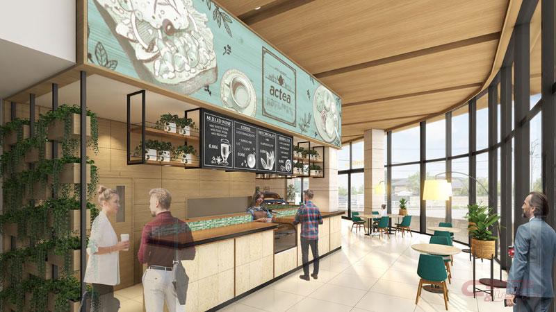 店舗1階には、「MITSUOKA 富山ショールーム」、「フィアット/アバルト富山」、飲食店舗ティールーム「actea」(アクティ) の3店舗があり、シームレスなフロア設計で、気軽にティータイムを楽しみながら、それぞれの店舗間を自由に移動することが可能となっており、2階には雄大な立山連峰を望めるプレミアムホールを設置している。