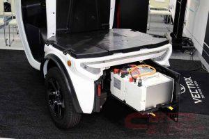 【アイカーゴ主要諸元】全長2130㎜/全幅1020㎜/全高1815㎜/シート高715㎜/車両重量246㎏/モーター:ブラシレスDCホイルハブモーター/定格出力4kW×2(左右輪)/最高出力4kW/バッテリー容量60Ah/充電時間4時間/最高速度:時速45㎞/最大積載量100㎏/バッテリー種類:リチウムイオン