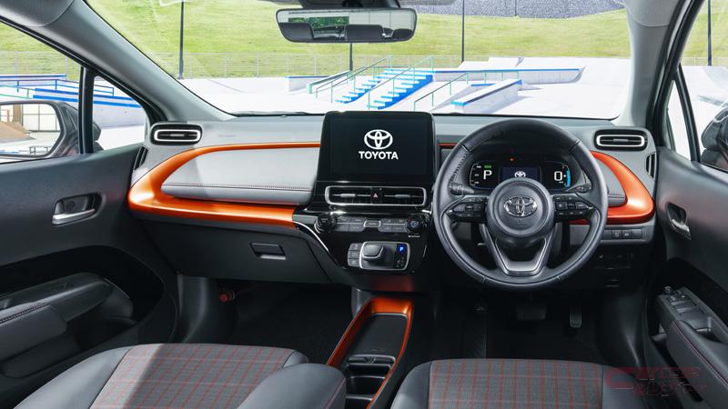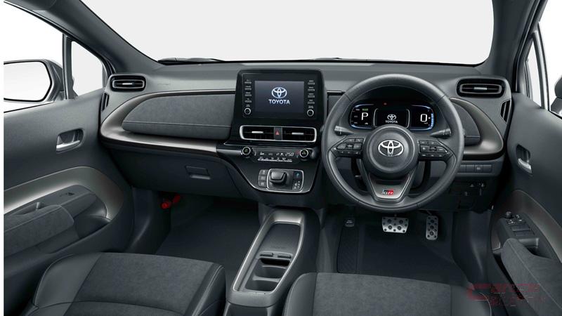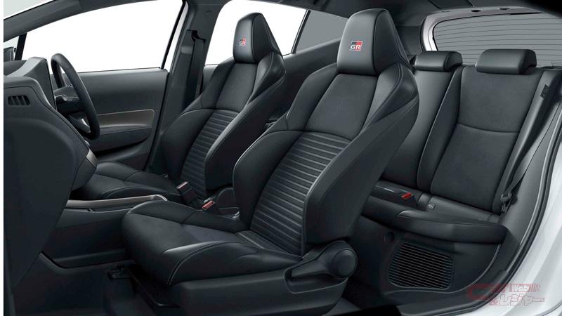 インテリアでは、専用シート表皮(エアヌバック+合成皮革)で特別感を演出したスポーティシート(GRロゴ付)を装備し、天井や周辺部品をブラックで統一。専用本革3本スポークステアリングホイール(GRロゴ付)、アルミペダル、専用コンソールオーナメントなどを採用しているほか、グロスを抑えたダークメタリック塗装、及びレジスターノブやインサイドドアハンドル(フロント)にはシルバー塗装を施した。
