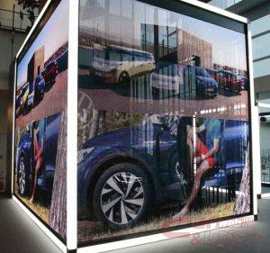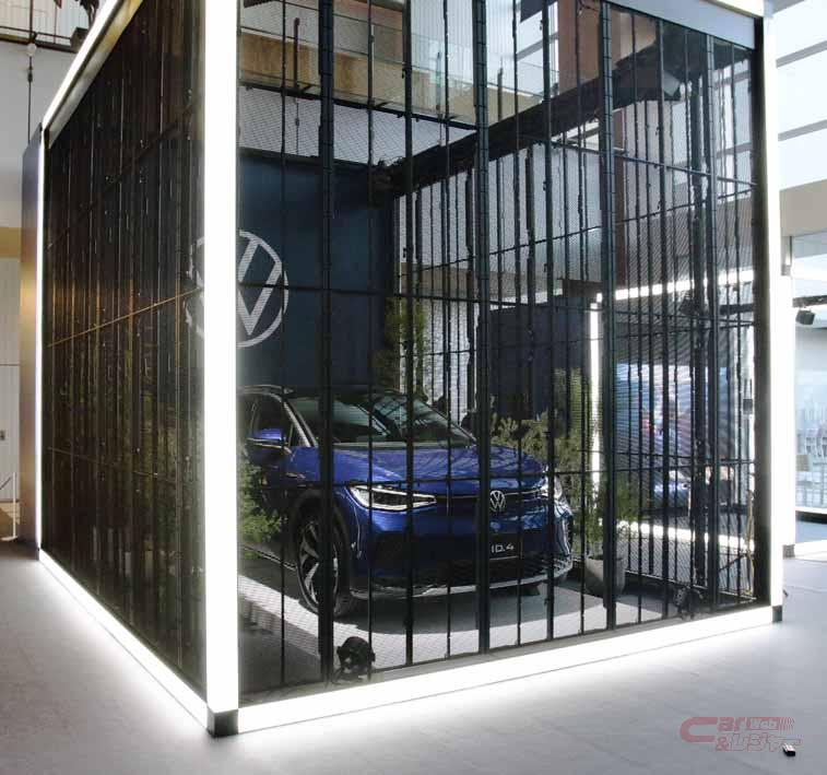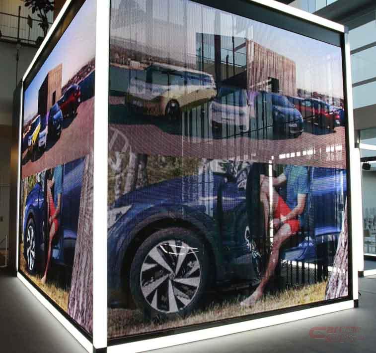 ①PRESENTATION SQUAREは、一見すると立方体(Square)をしたスクリーンだが、映像が終わると、実物のID.4が姿を現す。さらに、フレームに取り付けられた数々のLEDがリズミカルに発光する。