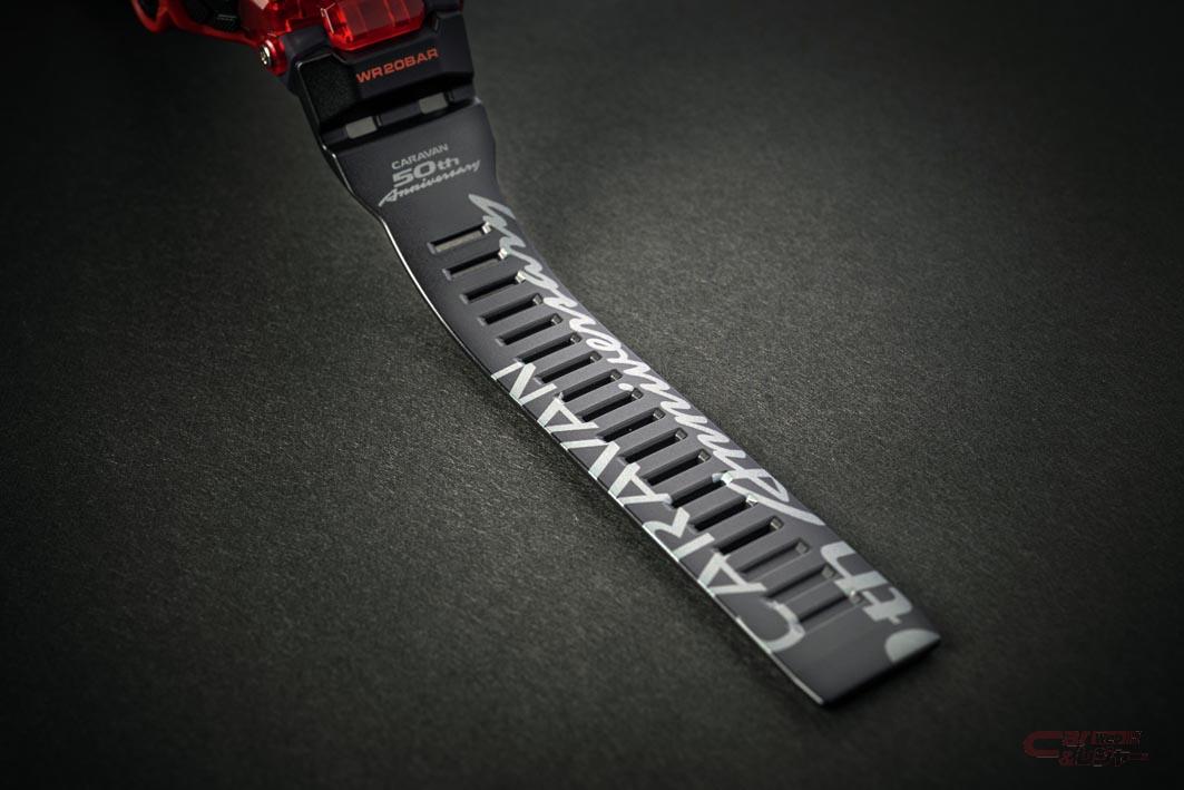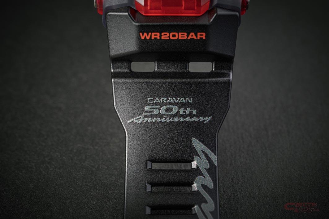 キャラバン誕生50周年を記念して作られた限定モデルのG-SHOCKは、GBD-100モデルをベースに、ベルトにキャラバンのロゴが印字されている。また、ベースモデルならではの耐衝撃性や防水性など“タフネス”さも兼ね備え、ブルーツース接続によりスマートフォンのGPS機能と連携することで、トレーニングログが取れるなど、機能面も充実している。