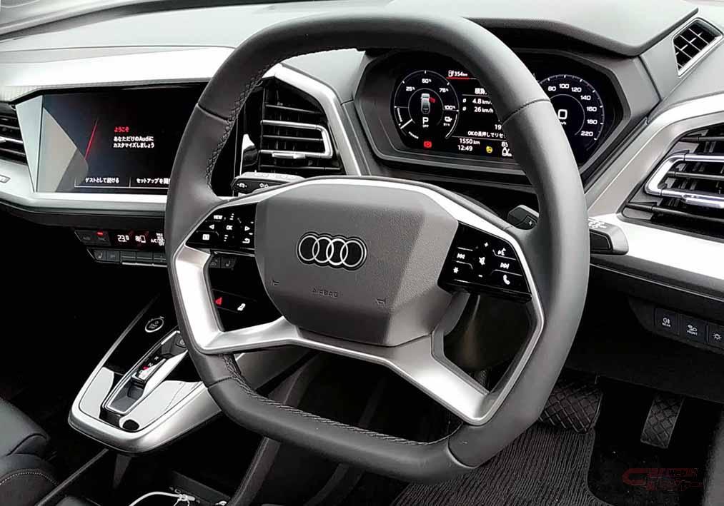 そうしたメカニズム上の特徴や620万円からという価格の設定。さらに、”エンジン車”と言われても違和感のないそのスタイリングなどからイメージできるのは、このブランド発のピュアEVの中でも最も間口の広いエントリーモデル的なその立ち位置。実際、それはインテリアのデザインについても同様で、上下を潰したような異形のステアリング・ホイールや宙に浮かんだイメージのセンターコンソールにこそ個性が感じられるものの、それ以外の部分は既存のアウディ車で見慣れた印象を受ける仕上がりだ。