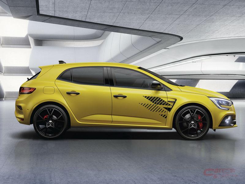 同モデルは、コーナリングスピードの向上を目的にロールを抑えたシャシー、トルセン®LSD、前輪アルミ製ハブ/鋳鉄製スリット入りブレーキディスクなど、クローズドコースでのスポーツ性能を高めたメガーヌ R.S. トロフィーの性能と装備を継承しつつ、ルーフとボンネットに配されたロザンジュをモチーフとしたブラックマットストライブ、ブラックアウトされたロゴ、ブラックの「フジライト」ホイールの採用によって、スポーティさが強調されたエクステリアデザインを採用。