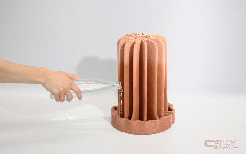 - 作品説明:不必要になったセラミックを活用した、電力を必要としないサステナブルな加湿器。3Dプリンターで表面積の多いユニークな形状を作り出すことで、吸水性を高めている。片面がフラットな形状のため、壁や窓際に沿って設置することも、複数を組み合わせて広いスペースに設置することも可能な設計になっている。