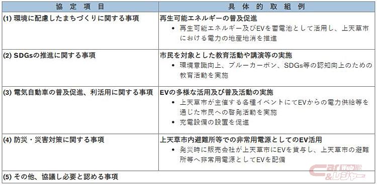 同協定は、上天草市の持続可能なまちづくりの実現に向け、「走る蓄電池」となる電気自動車(EV)の普及を促進することにより、温室効果ガスの削減、災害対策の強化等の地域課題の解決およびSDGsの推進に取り組むことを目的とした協定で、ゼロ・エミッション社会の実現を目指す日産の「ブルー・スイッチ」活動としては205件目の取り組みとなる。