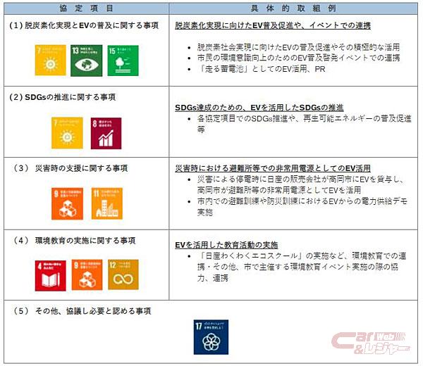 今回は日産が推進する「ブルー・スイッチ」と、高岡市が推進する環境・防災対策やSDGsの推進との、双方の取り組みにお互いが賛同して協定締結が実現した。両者は今回の協定締結を機として、3月開催予定の高岡市内の飲食及び物販イベント「御旅屋人マーケット」をはじめとするイベント出展での連携や、電気自動車の部品リサイクルなどの検討なども共に進めるなど、今後も、EVを活用した、環境に優しく災害に強い持続可能なまちづくりを推進し、美しい自然環境を未来に残すため、EVの普及を通じた地域課題の解決、脱炭素社会実現、SDGs達成に向けて、更に連携を強化すると述べている。