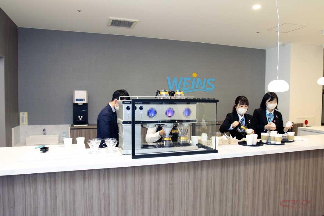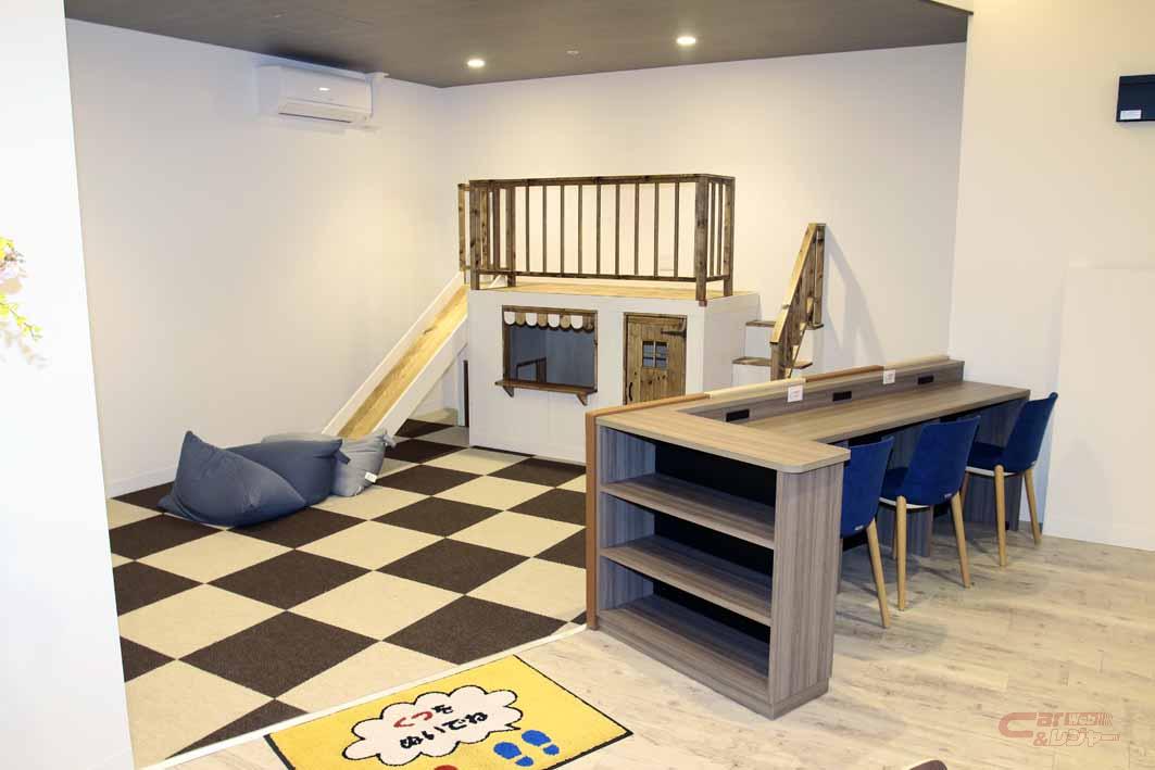 2階はショールームと商談スペースになっており、高性能のコーヒーメーカーが置かれカフェのような芳香に包まれている。全体的に落ち着いた色合いで、テーブル席の他コンセントを備えた一人用席も多く設け、整備作業の待ち時間を有効に活用できる。新たにファミリー層の来店が増えることも期待され、キッズコーナーも工夫され保護者が見守れるカウンター席も用意した。