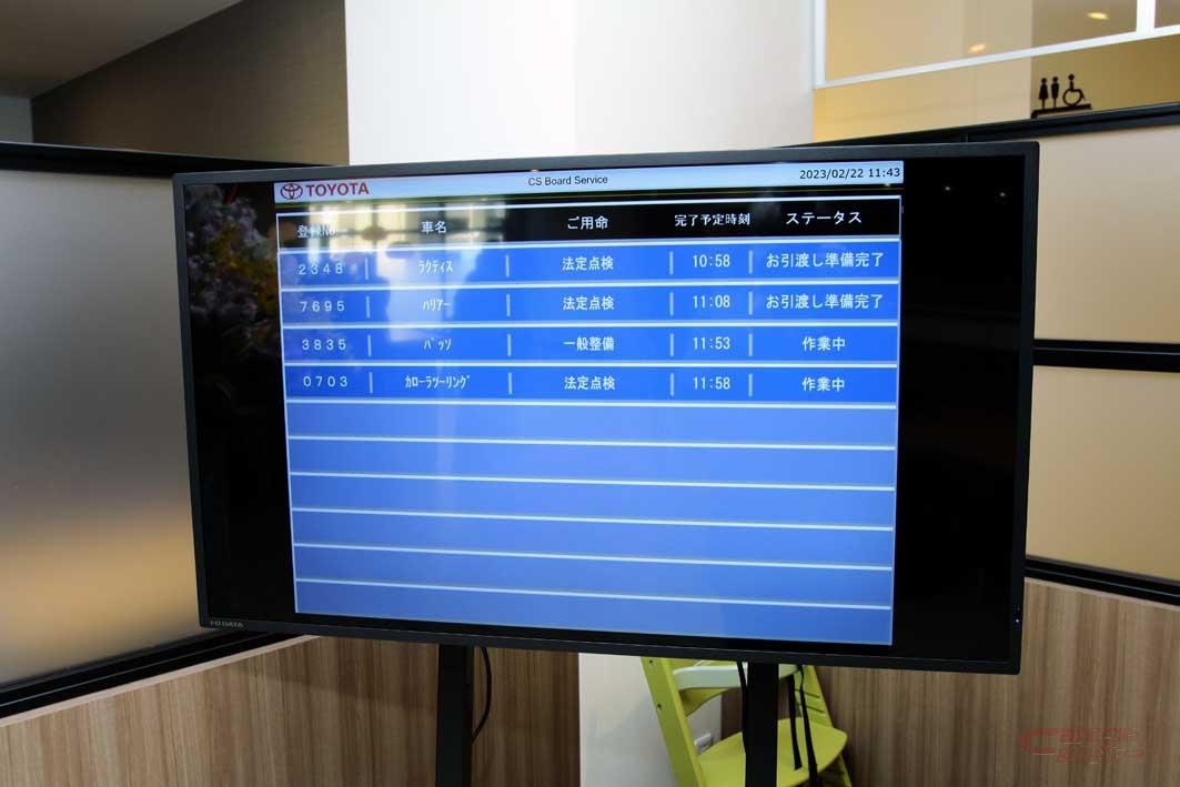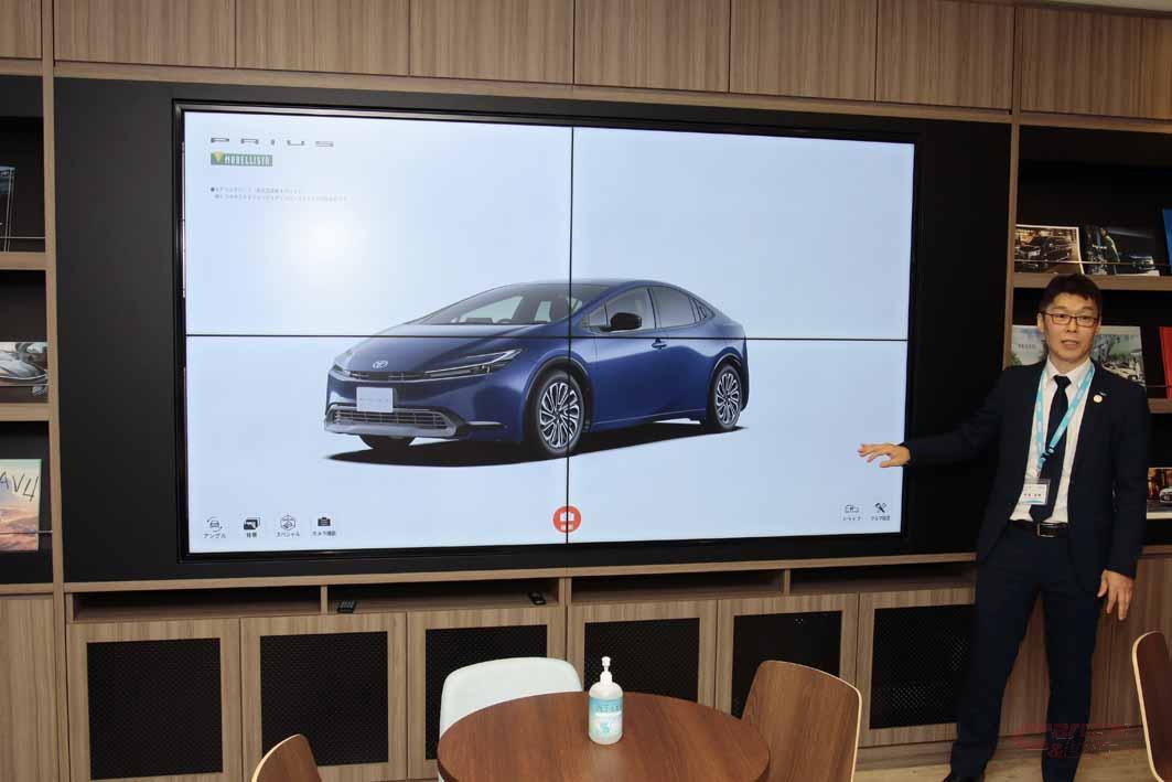 さらに、新たな取り組みとしてショールームには展示車両を置かず、大型液晶モニターを活用するITツール(トヨタイメージクリエーター)を同社で初めて設置。多くの車両を展示できないという、狭あいな土地の新車店舗の課題を解決した。
