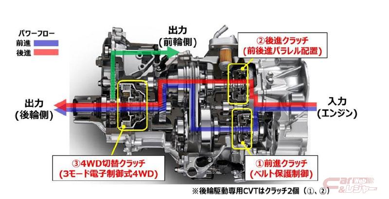 同社では上記課題の解決に向け、軽商用車初となるFR車用のCVTを新開発するとともに、様々な路面状況や目的に合った走行性能を実現できる、3モード電子制御式4WDを開発。特にFR車用CVTに関しては、キャブオーバーレイアウトという限られたユニット搭載スペースの中に収まるよう、小型化、低背化が必須であるとともに、商用車に求められる耐久信頼性についても課題があり、それらを克服するため、以下の技術を開発した。