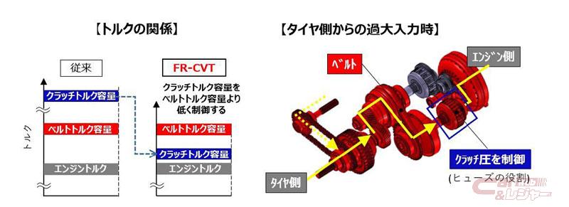 - ベルト保護制御【耐久信頼性技術】:常時クラッチ圧を制御することにより、過大入力に対してクラッチを滑らせ逃がすことで、ベルトの耐久信頼性を確保した。(図1及び図2参照)