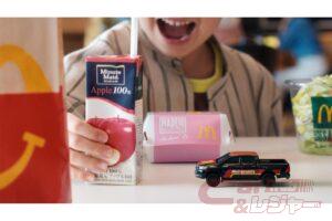 プレゼントされるトミカのハイラックスは、ボディサイドにマクドナルドの英文ロゴが描かれルーフとエンジンフードはコーポレートカラーで彩られ、なおかつおなじみの“M”のロゴも入る。サスペンションが搭載され車体を押すと上下に動き、荷台のテールゲートは開閉可能となっている。