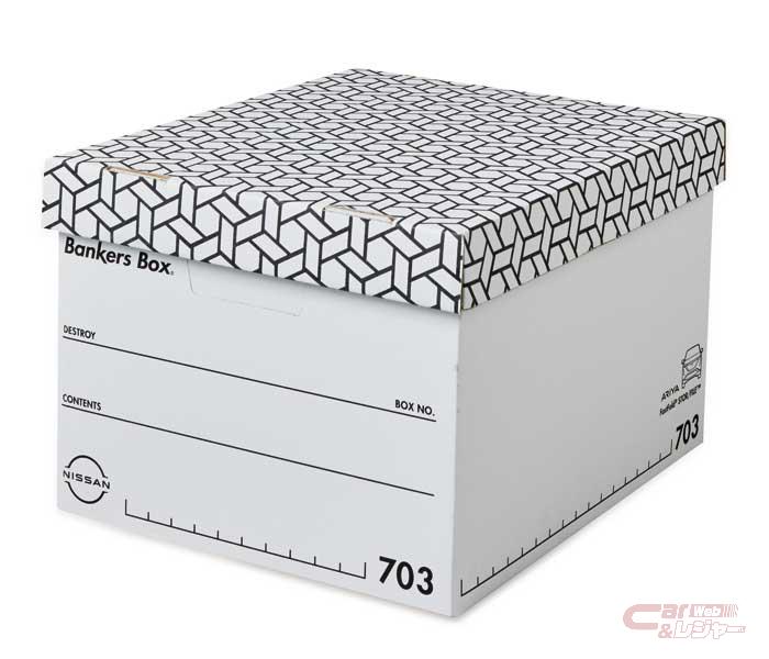 - NISSAN Bankers Box:軽くて丈夫な段ボール素材の保管・収納ボックス。側面にはARIYAの車両のイラストを採用。