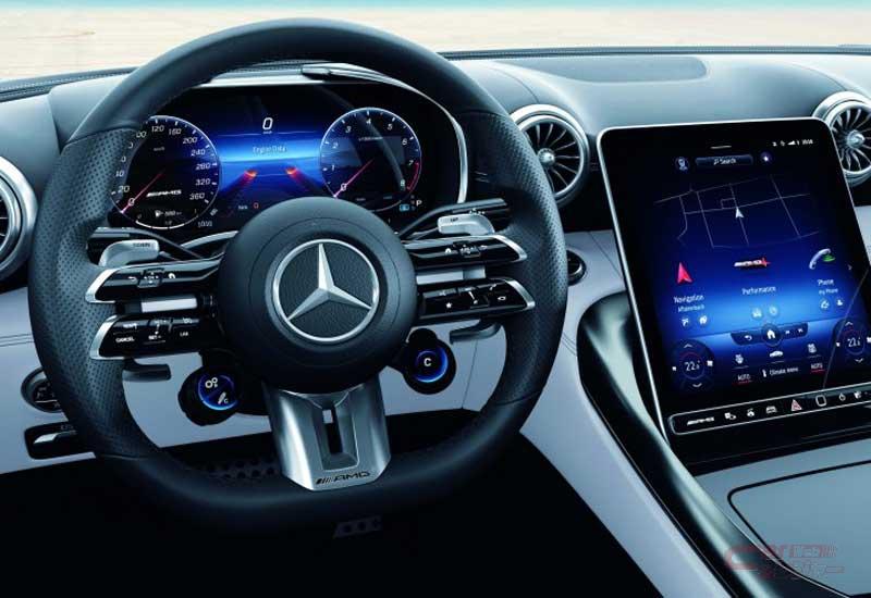 新型SLはメルセデスAMGによる完全自社開発モデルとして生まれ変わり、SL専用の高剛性プラットフォームによる卓越したドライビングパフォーマンスと快適性を兼ね備えたドライバビリティ、2+2シートレイアウト、AMG製V8ツインターボエンジンがもたらすパワフルなドライビングを実現したモデル。また、インテリアはアナログとデジタルを融合した「ハイパーアナログ」デザインを採用することで、300 SLのデザインをオマージュしながらもラグジュアリーで快適な空間を実現している。