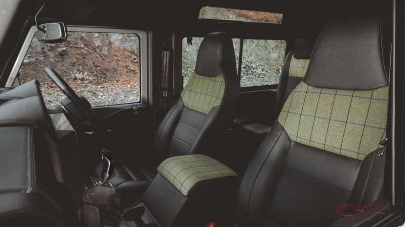 内装では、プレミアム・ディフェンダー・シート、サイドトリム、ドア、ルーフライニング、ダッシュボードに、エボニー色のウィンザーレザープレミアムシートを使用し、アイラ毛織物工場から調達したユニークなツイードのディテールを組み合わせたトリムを採用した。特別にデザインされたセンターキューブには、アイラ島のキルホーマン蒸留所のウイスキー樽のオーク材とウォールナットを組み合わせた、取り外し可能なウッドトレイを装備している。