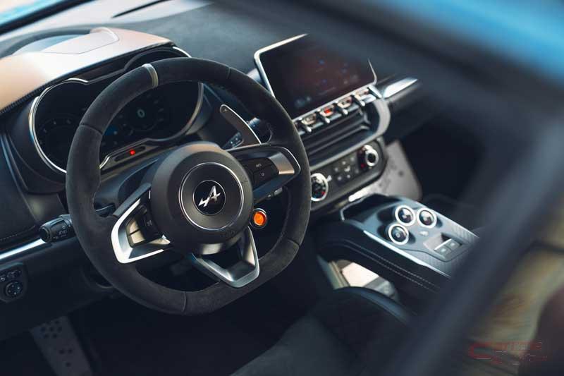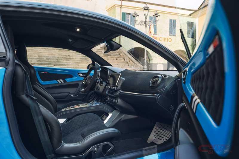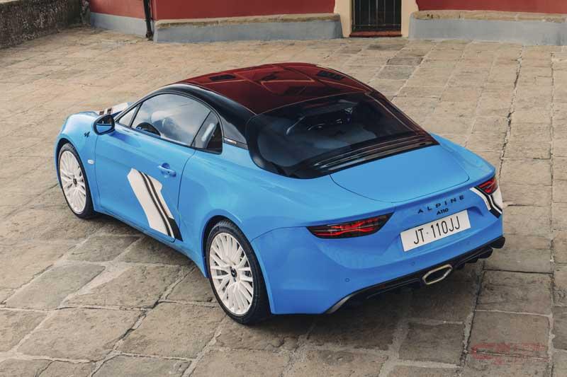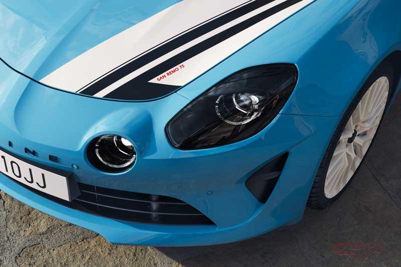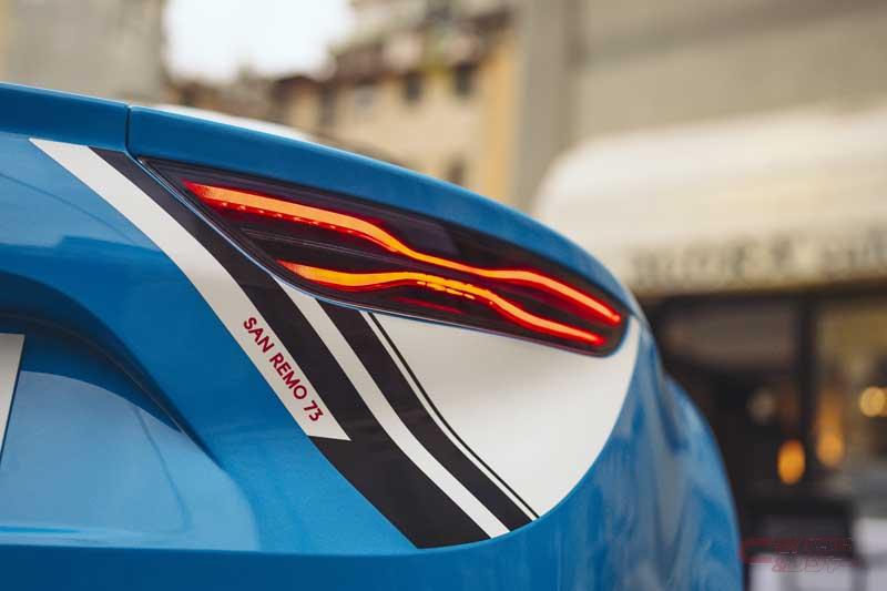 今回発売した限定車は、チャンピオン獲得が決定したサンレモラリー優勝50周年を記念した限定モデル。車体色には限定車専用となるブルー キャディ×ノワール プロフォン Mを設定し、レッドコーティングされた専用カーボンルーフや、フロント・サイド・リアに施されたSAN REMO 73 専用デカール、ブリリアントホワイトのGRAND PRIX18インチアロイホイール等が装備され、先代A110を思わせる外装となっている。