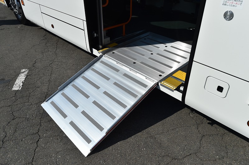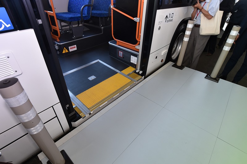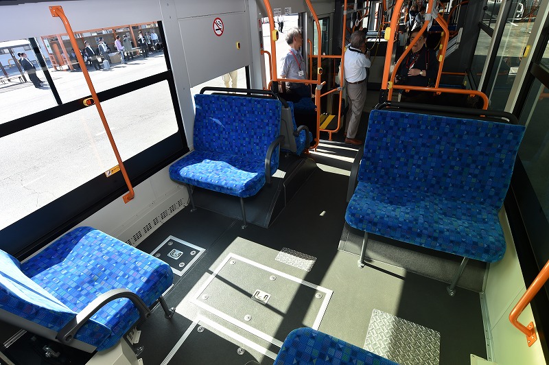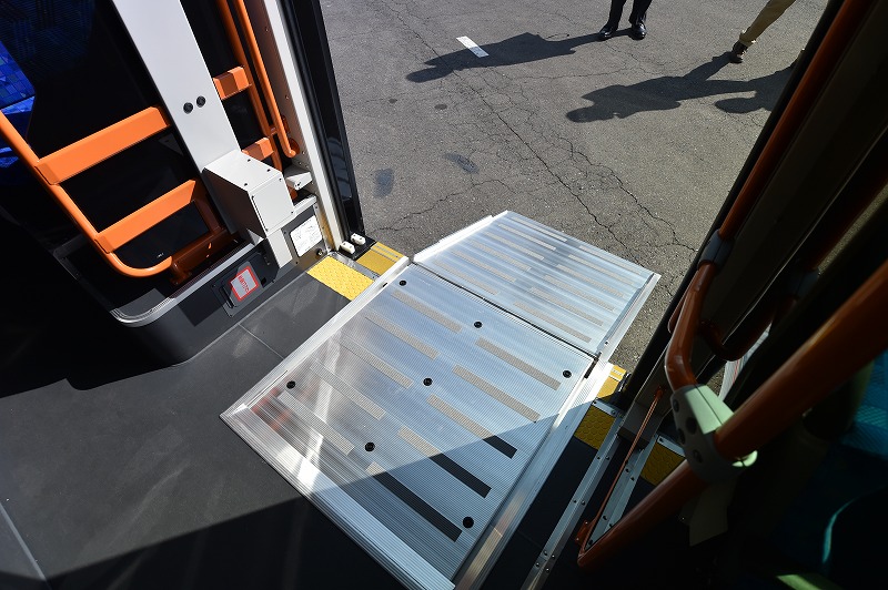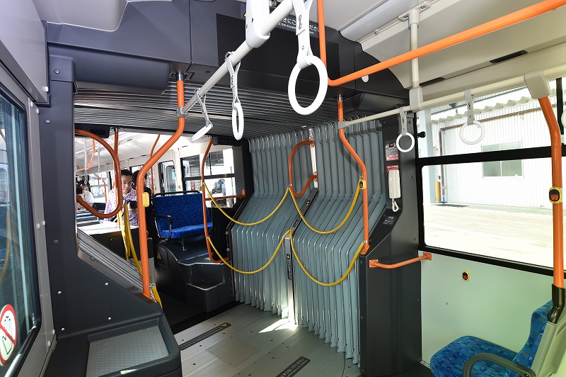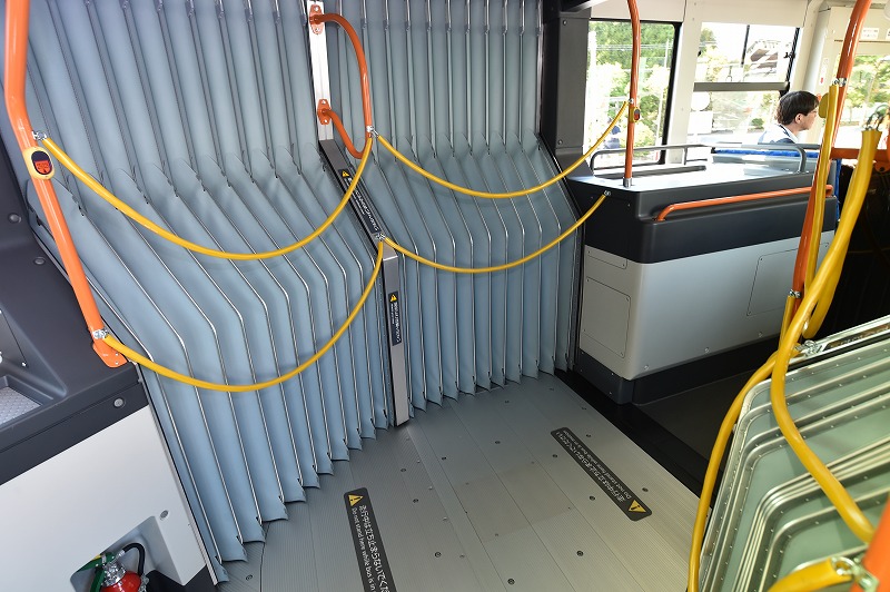 ボディサイズは全長17m99cm×全幅2m49.5cm×全高3m26cmで、一般的な大型路線バスの1.5倍となる定員120名の大型輸送に対応する。計3カ所ある扉は前後車室ともに有効開口幅を1m確保するとともに、フロアは前車室がフルフラット、後車室もノンステップエリアを広く確保。さらに、車いすスロープ板や対面シートも採用し、乗降性、利便性、快適性を高次元で実現した。