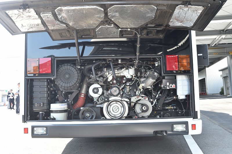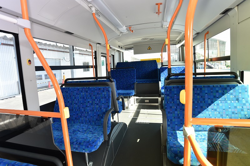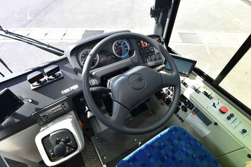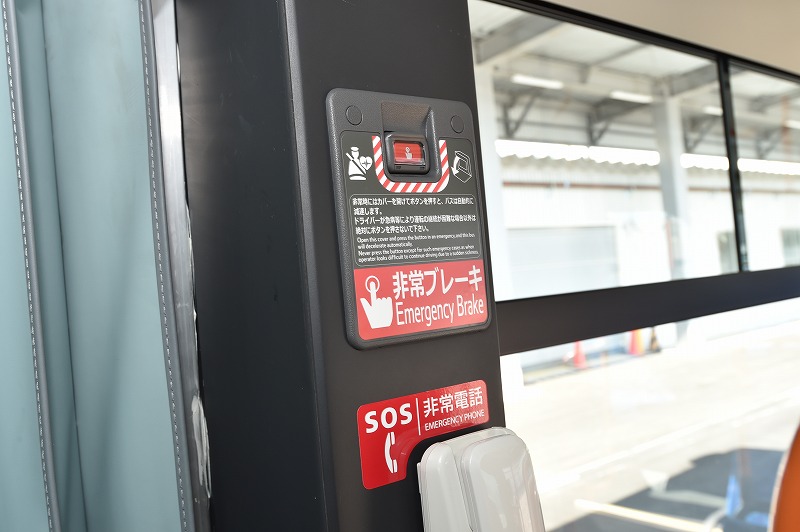 先進安全装備で注目されるのが、路線バスで世界初となる「EDSS(ドライバー異常時対応システム)」。EDSSは運転士に体調不良などの異常を発生した場合、運転士自ら、または乗客がバスを停車できるもので、運転席の右側、運転席の右下、運転席後ろのポール、後車室には3箇所設置した赤いボタンを押すことで作動する。立っている乗客がいることを想定し、ボタンを押した際は停止動作に入るまで3・2秒あり、ゆっくりと減速しながら車内の赤色ランプと音声アナウンスによる警告を発し、その後クラクションを鳴らしながら停止する。また、乗客による誤操作も3・2秒間で運転士が対応してキャンセルすることも可能となっている。