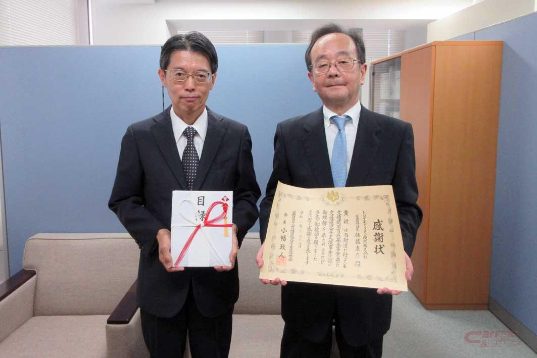 ※メイン写真は、目録を持つ菅野専務理事(左)と感謝状を持つ白野常務