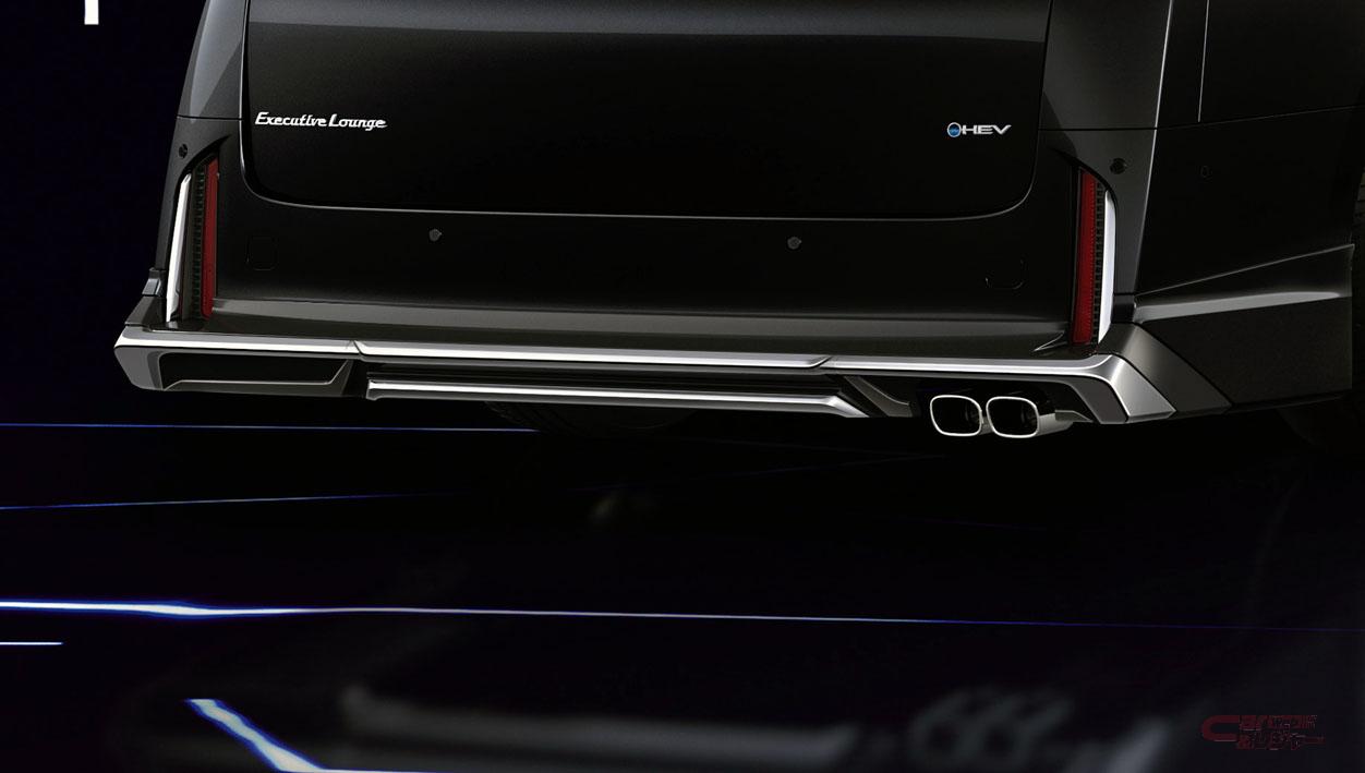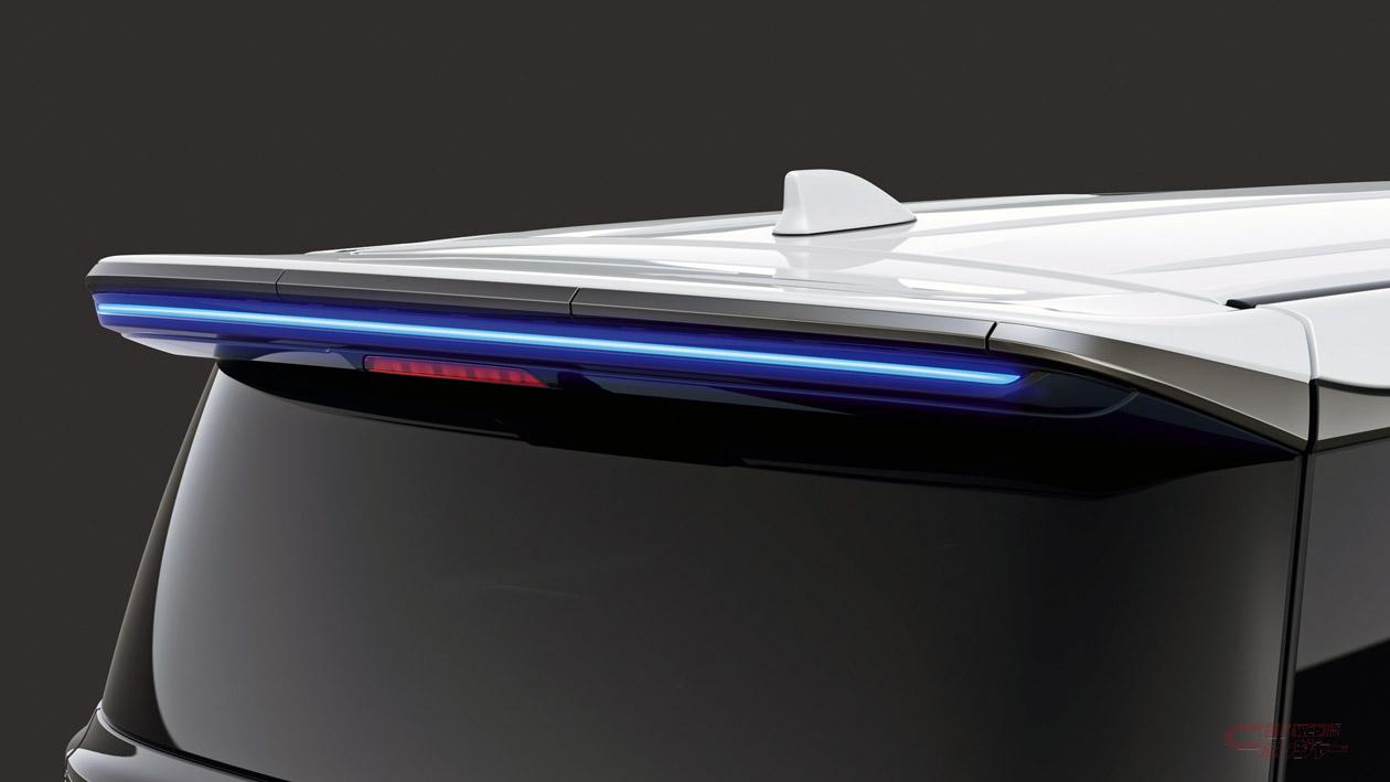 エアロパーツセットに加え、大胆なメッキとボディ色のコンビネーションが押し出し感を強調するフロントグリル、コの字形状のメッキとブルーイルミで先進的な輝きとプレミアムな佇まいを付与するシグネチャーイルミブレード、横一文字に伸びたブルーのLEDが、リヤビューに迫力と煌めきをプラスするイルミルーフスポイラーを設定している。