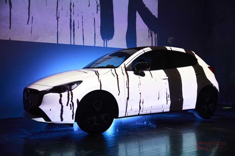マツダは、国内外で数々の受賞歴を持つ映像作家であり、写真家の柿本ケンサク氏とコラボレーションしたMAZDA2の新機種「15 BD」を展示。鑑賞者の立ち位置や移動の軌跡をAI解析し、真っ白なキャンバスに見立てた「MAZDA2」にプロジェクションマッピングで柿本ケンサク氏の作品を投影する。