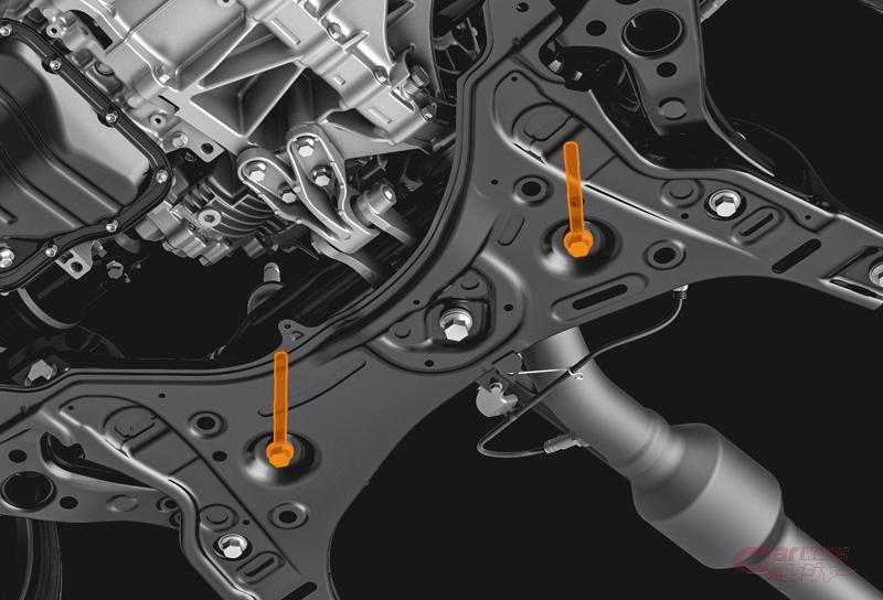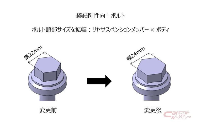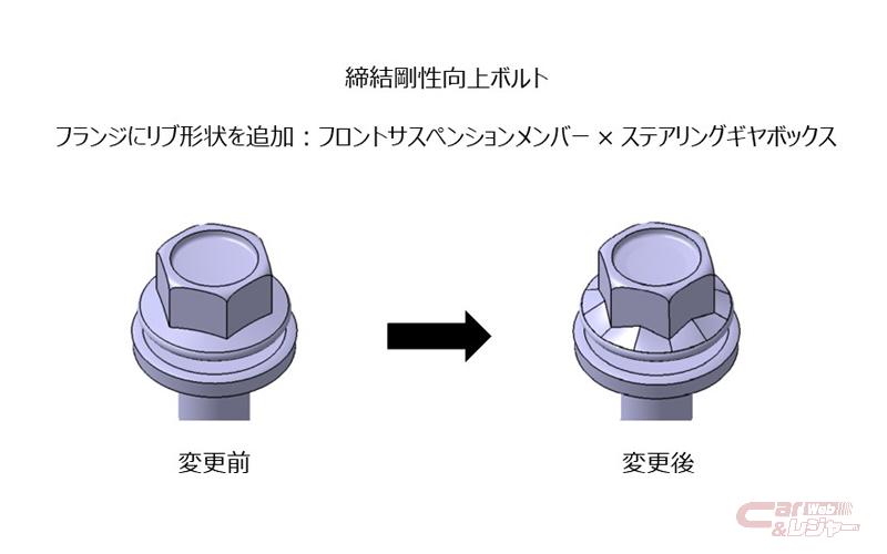 運転操作に対するダイレクト感を向上するため、シャシー部品を締結するボルトの一部に締結剛性向上ボルトを採用。ステアリング操作に対する応答性と直進安定性を向上し、クルマとの一体感を進化した。