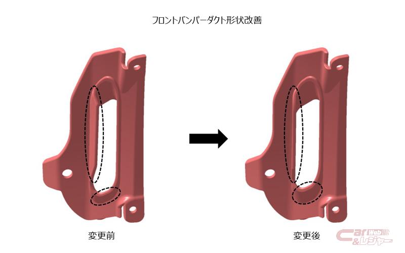 また、スタビリティの向上では、フロントバンパーダクト形状の改善により、ホイールハウス内の空気の流れを整流化し、空力性能や操縦安定性を改善。操縦安定性を向上した。