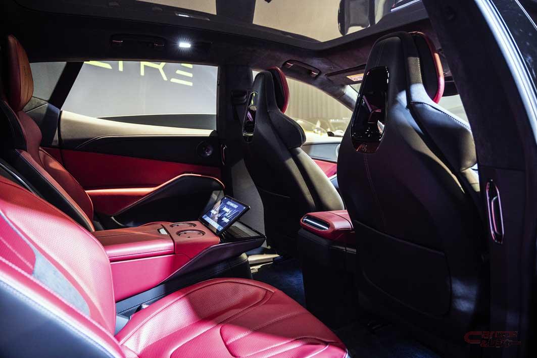 パワーユニットは、二つの電気モーターを持つ全輪駆動で、時速0~100㎞加速は2.95秒(エレトレR)とスーパーカーに比肩する俊足を誇る。航続距離は最大600㎞で、急速充電は20分で10~80%の充電を完了する。