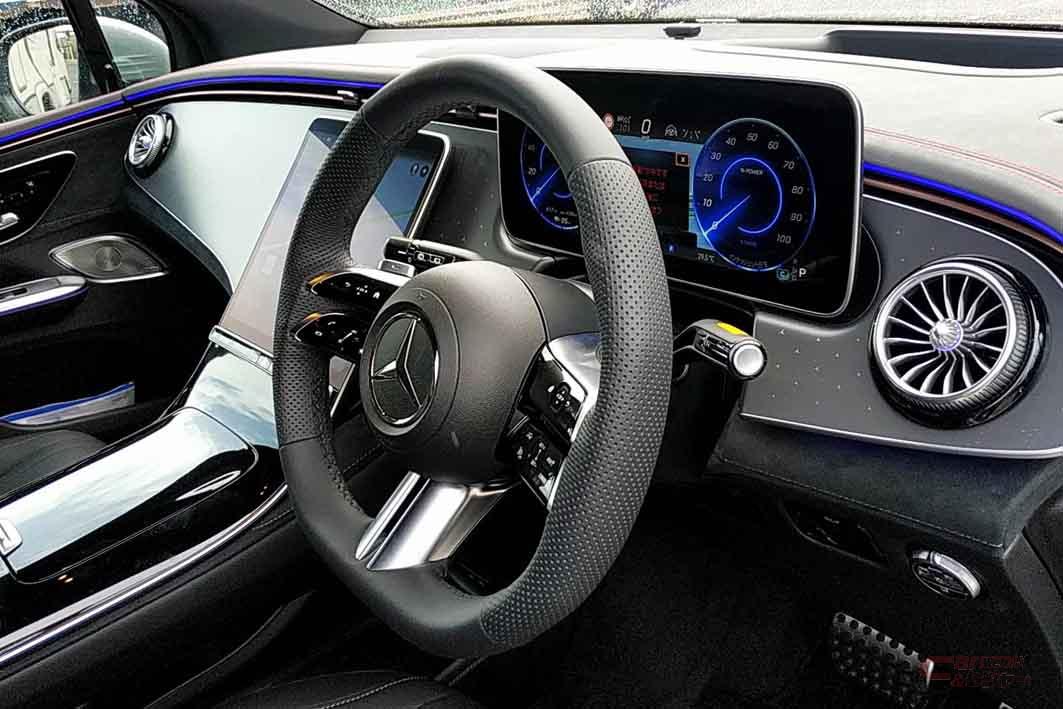 率直なところ、ピュアEV専用に構築されたプラットフォームを共有することもあってか、その乗り味にもかなりの近似性が感じられた。今回のテスト車は、二種類がラインナップされる日本導入仕様の中にあってはよりベーシックな位置づけとなる『350 4マティック』の、AMGラインパッケージやエクスクルーシブパッケージを標準装備とする”ローンチエディション”。