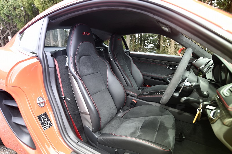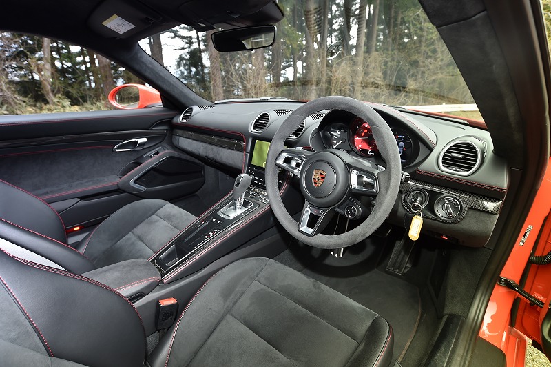大径のアルミホイールや、ソリッドな雰囲気が印象的なインテリアからもスパルタンな雰囲気を漂わせる718ケイマンGTS。着座位置の低い運転席につくと背後から野太いエンジン音が耳に届き、走り出す前からマカンなどのSUVでは無いピュアなポルシェらしさを体感できる。