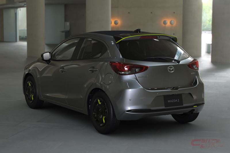 MAZDA2の商品改良では、“15 BD”、“XD BD”に用品架装パッケージ車“SCI-FI”を追加設定。“さりげなく垣間見えるディテールに自分らしいこだわりを楽しむ”をコンセプトにしたパッケージで、推奨する車体色としてマシーングレープレミアムメタリックとジェットブラックマイカの2色を設定。フロントグリルやリアルーフスポイラー、フルホイールキャップ等に、推奨車体色とのコントラストが映えるライムグリーンのアクセントを各パーツの裏側に採用し、さりげない遊び心を演出している。希望小売価格は11万6600円(取付費込)。