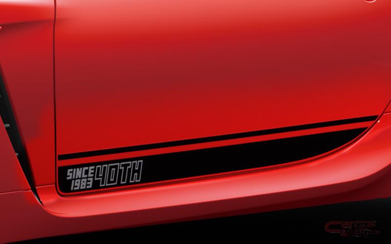 特別仕様車RZ“40th アニバーサーリー リミテッド”は、RZグレードをベースに、外装では、車体色にスパークレッドとクリスタルホワイトパールの2色を設定。AE86の赤×黒・白×黒のツートーンをオマージュした40周年記念専用デカール、アウトサイドドアハンドル(クリスタルブラックシリカ)、GRトランクスポイラー(販売店装着オプション/クリスタルブラックシリカ選択可能)、ダークグレーメタリック塗装の215/40R18タイヤ&18×7 1/2Jアルミホイール(センターオーナメント付)等を装備。