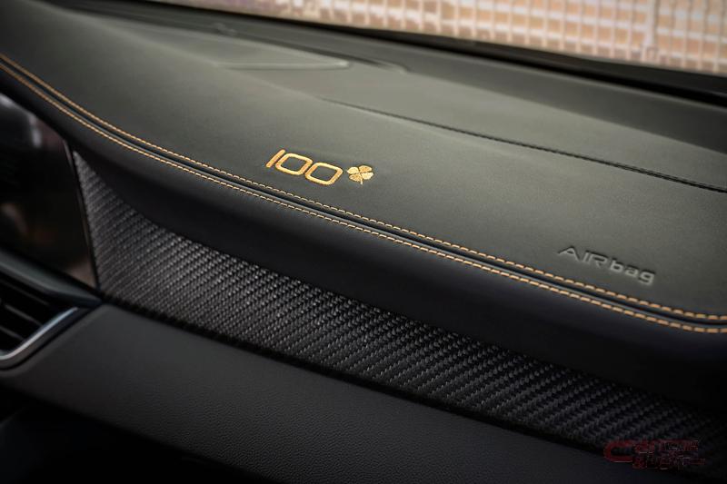 ブラックを基調とした内装では、随所にゴールドステッチを採用している他、全席にレザー/アルカンターラシートを採用し、フロントダッシュボードには100周年記念特別ロゴのゴールドステッチをあしらい、高級感のある室内空間とした。