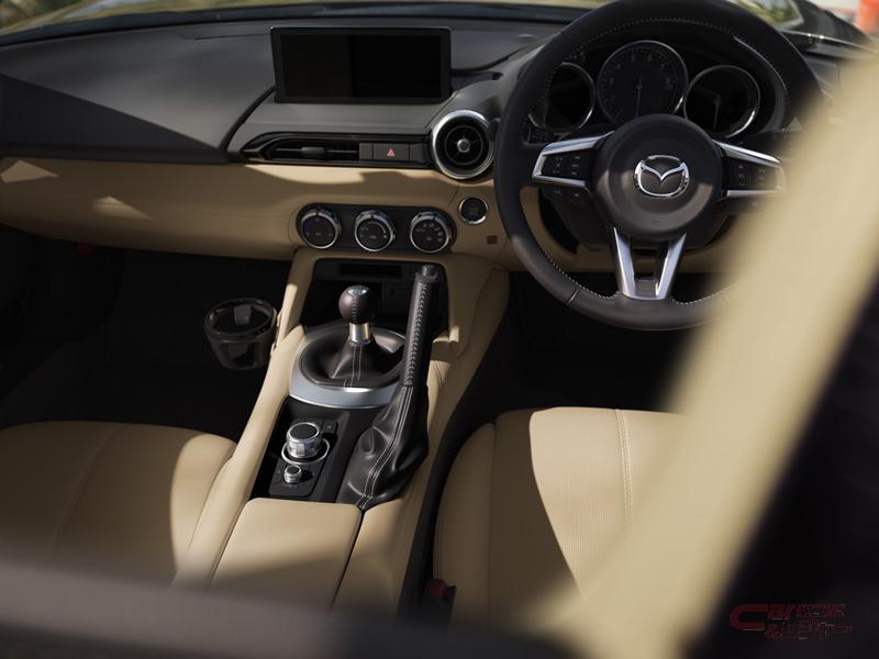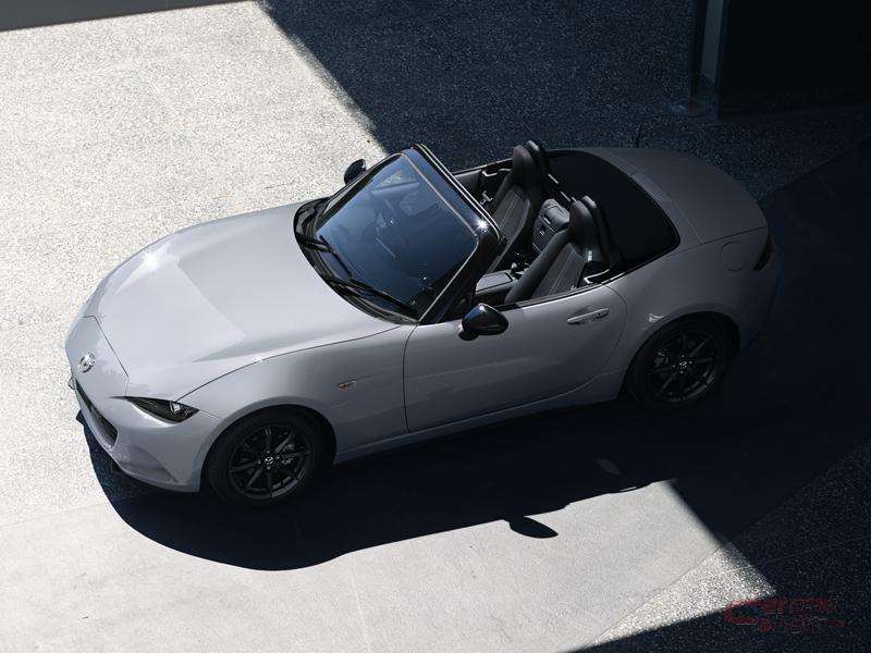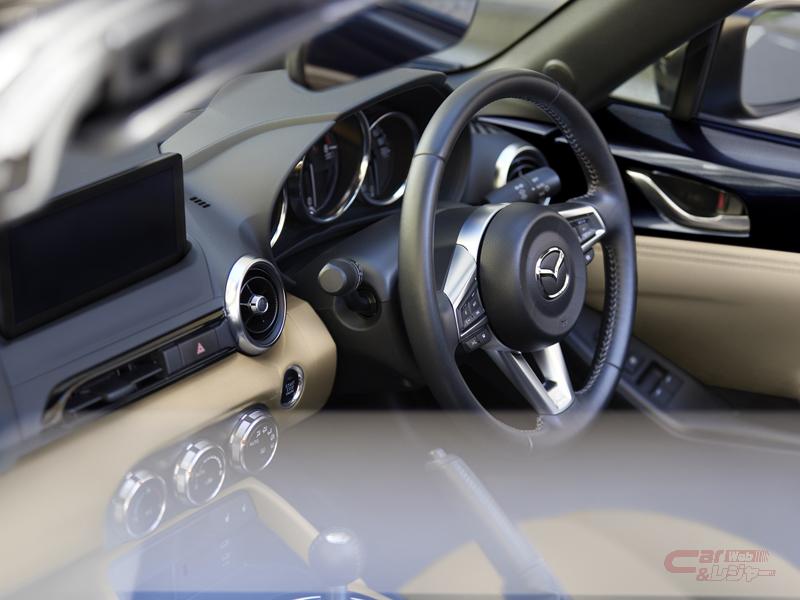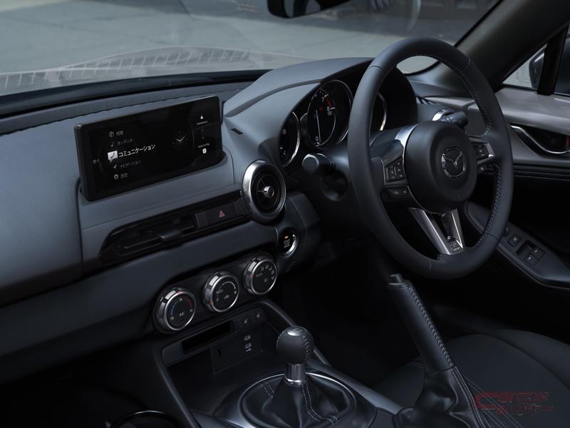 外装では、ヘッドランプおよびリアコンビネーションランプ内のすべてのランプをLED化した他、デイタイムランニングランプを変更することでよりスポーティな印象の目元を強調。さらに、歴代のロードスターから踏襲する“円形+楕円”のモチーフをより鮮明に表現したリヤコンビネーションランプを採用した。足元は、軽やかさと機能美を表現した新しいデザインのホイールを装備。車体色にはエアログレーメタリックが追加設定された。内装では、8.8インチのセンターディスプレイを新たに採用している。
