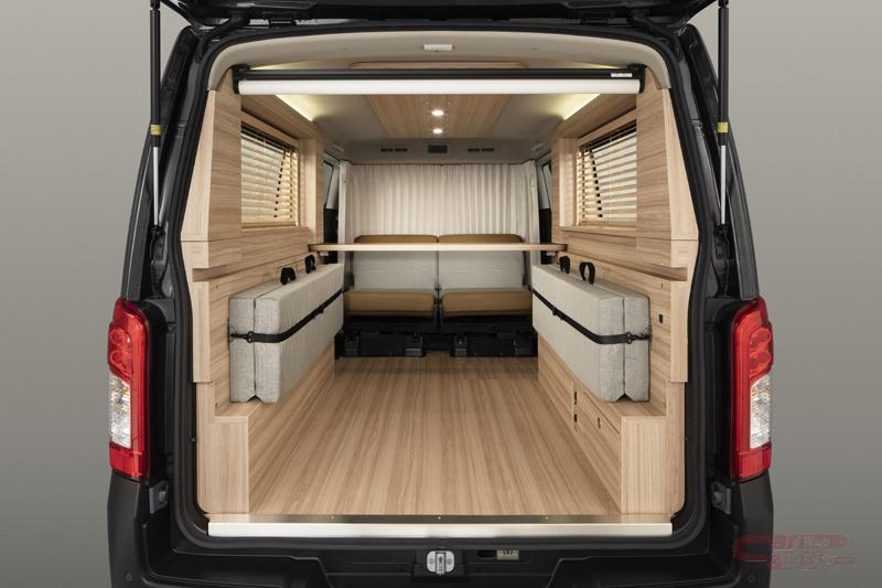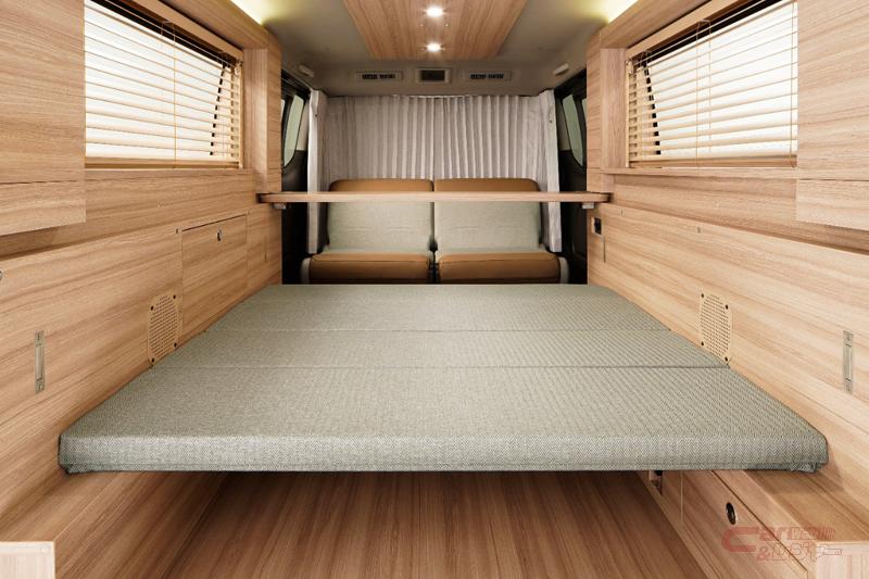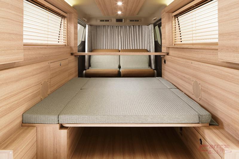 また車中泊用のベッドでは、ヘリンボーン生地を採用した、2分割の折りたたみベッドか、ワンアクションでベッド展開できるMYROOM跳ね上げベッドの選択が可能な他、好きな位置で固定できるスライドテーブルを装備。ベッドとテーブルを組み合わせることで、リビングルームモード、ベッドルームモード、ダイニングルームモード等の車内アレンジも可能となっている。