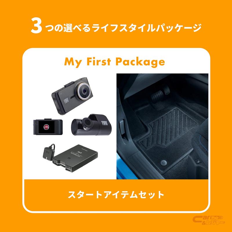 同キャンペーンでは、車両価格は据え置きのまま、10~13万円相当のアクセサリーパッケージをセットでプレゼントする。アクセサリーパッケージは、①My First Package:FIAT純正フロアマット、ETC車載器、モニター付ドライブレコーダー(フロント・リア)、②Music Lover:BEWITH プレミアムサウンドシステム フロントスピーカーセット、③Camp Lover:FIAT純正カーサイドタープの3種類を用意。