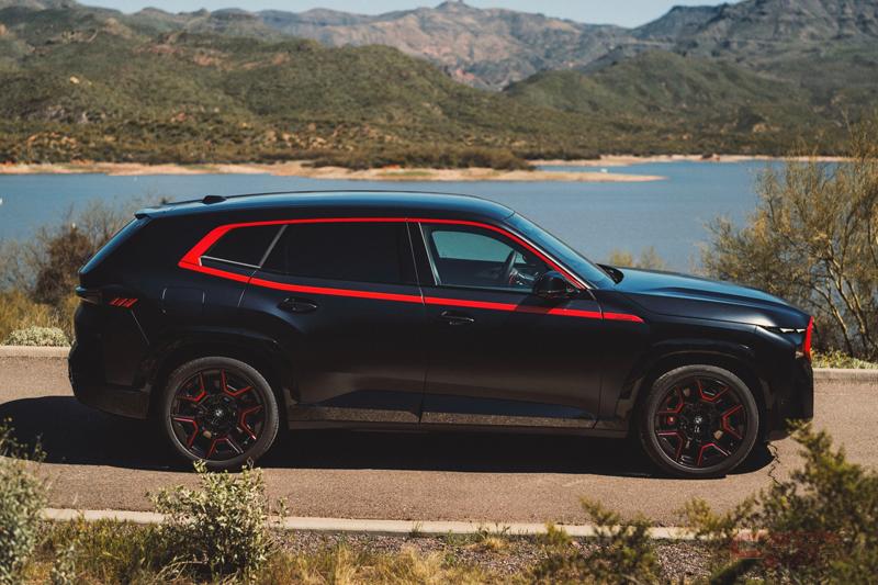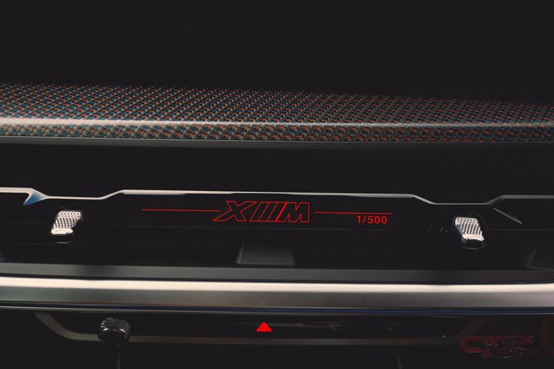 XM レーベル レッドは、内外装の随所にレッド・アクセントを採用した限定モデルだ。外装では、キドニー・グリルやウィンドウまわりにトロント・レッドのアクセント・バンドを採用している他、専用の22インチ・ホィールのインサート・カラーおよびMスポーツ・ブレーキ・キャリパーもレッドに塗装され、鮮烈な印象を強調。車体色にはBMW Individualフローズン・カーボン・ブラック・メタリックを設定し、インテリア・トリムには限定台数を示す“1/500”のレタリングが施されている。