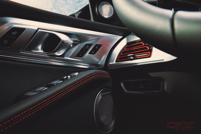 内装では、専用のブラックとフィオナ・レッドのバイ・カラーにレッド・コントラスト・ステッチをほどこしたBMW Individualエクステンド・レザー・メリノ・シートや、Mカーボン・ファイバー・トリムを採用し、上質でスポーティな室内空間とした。