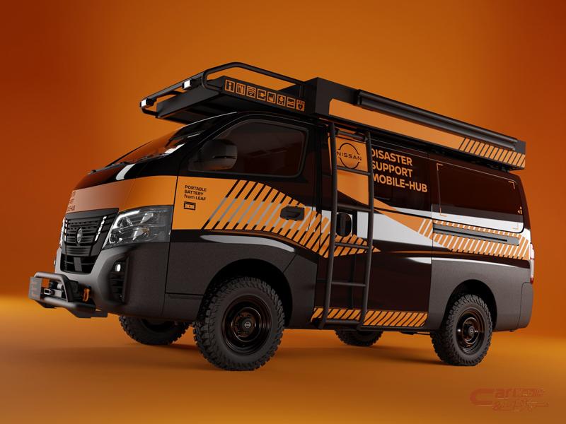 「キャラバン」をベースにした、緊急・災害時には防災拠点にもなる支援車両(Mobile-Hub)を提案。2023年9月に発売した「ポータブルバッテリー from LEAF」を複数搭載し、避難時のライフラインをはじめ、様々な困りごとを解決できる装備を搭載(参考出品)